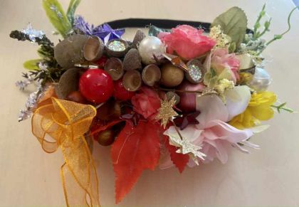 Ob bunte Farbenfee, zarte Tanzmaus, kräftige Bienenschamanin oder ... es ist, was es für Dich sein soll! Wir fertigen aus vielseitigen Natur- und Dekoelementen, aufsetzend auf ein Trägerelement aus Leder, diesen besonderen Kopfschmuck. Befestigt wird er mit einem Gummi und auf Wunsch mit farbigen Bändern.