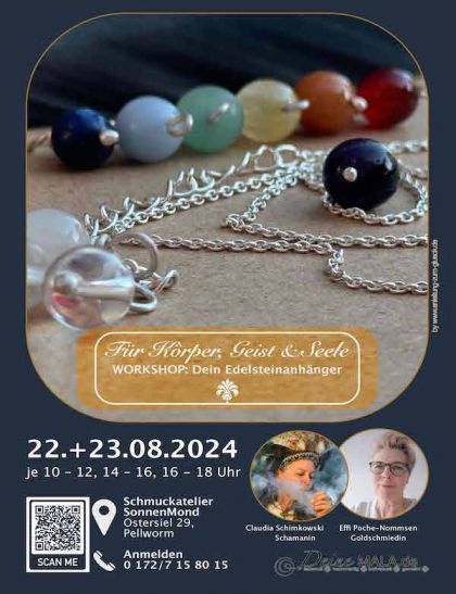 22. + 23.08.2024 - 10 - 12, 14 - 16, 16 - 18 Uhr - Individuell ausgetestet mit Schamanin Claudia Schimkowski fertigt Goldschmiedin Effi Poche-Nommsen einen persönlichen Perlenanhänger für jeden Teilnehmer: Einfach zur Stärkung oder zur Unterstützung bei Deinem aktuellen Thema.